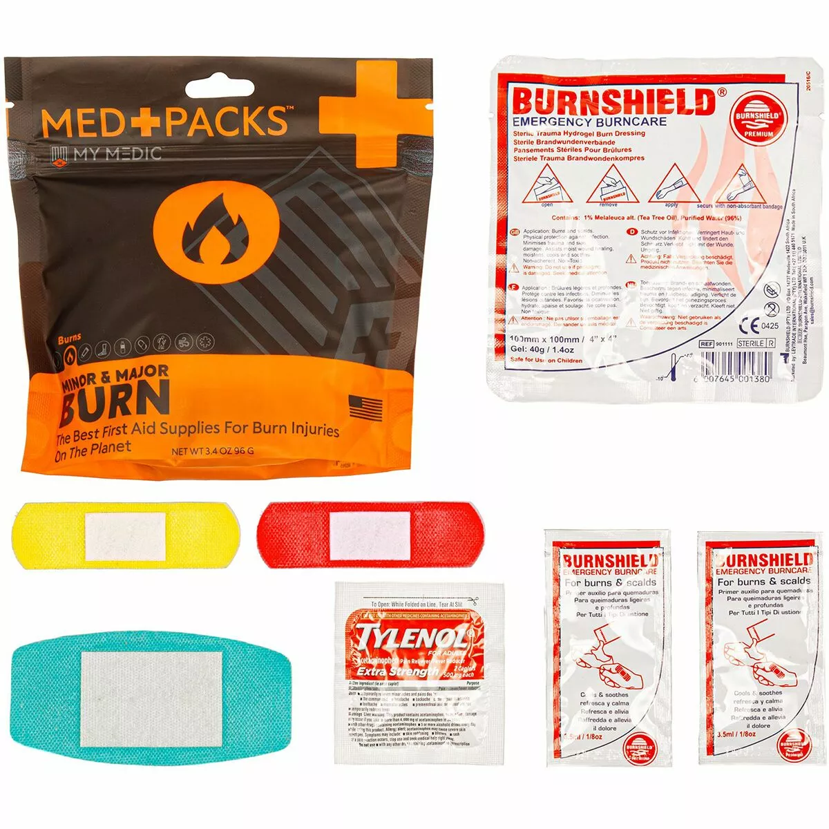 - Includes: 2 small bandages, 1 large bandage, 2 burnshield gels, 1 burnshield, 2 tylenol caplets